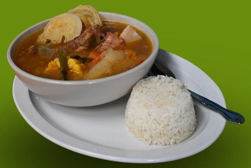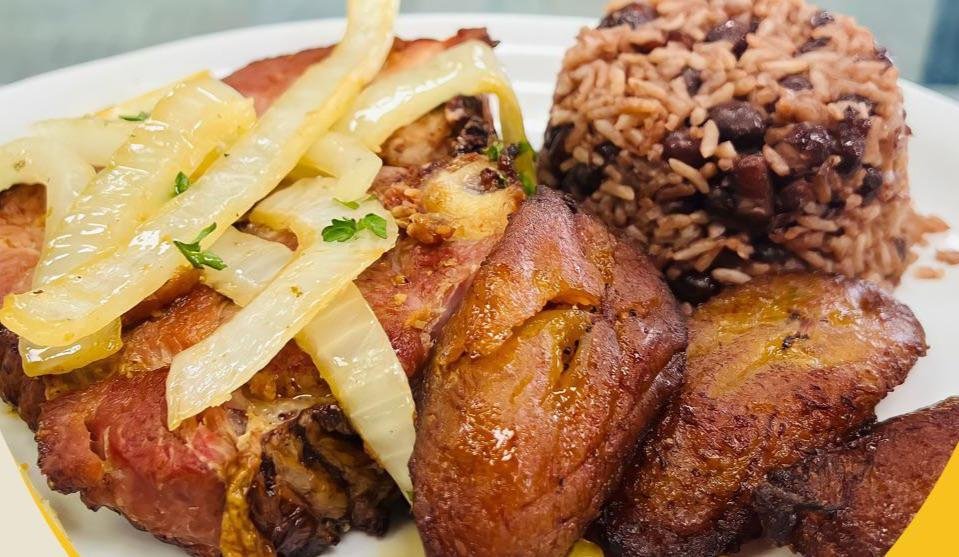 Rice with sausage, 2 eggs, cream, and sweet plantains or corn tortilla.